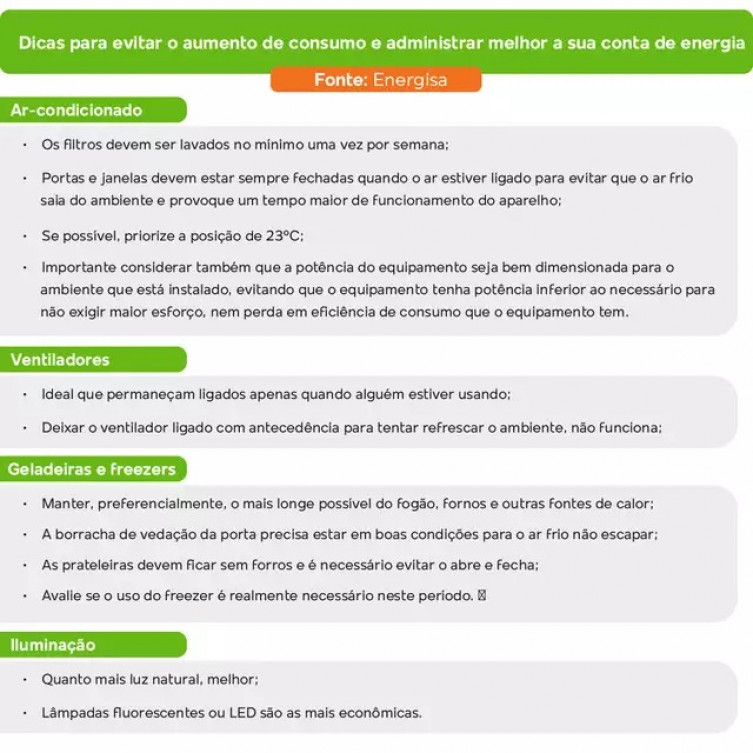 Ela também orienta sobre manter o ar-condicionado sempre na temperatura 23. “Ar-condicionado e ventilador não tem jeito. A orientação que a gente dá é comprar um modelo mais eficiente, inverter, e usar sempre no 23. Eu estive acessando alguns colegas engenheiros, se muda do 23 para 21, puxa mais 7 quilowatt só por conta dessa mudança e vai resfriar igual”, completou.
