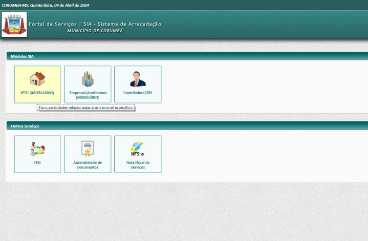 No site da Prefeitura de Corumbá (www.corumba.ms.gov.br) o cidadão pode clicar no banner do IPTU, visível assim que a página é acessada, ou ir até a área de Serviços ao Cidadão e clicar em Portal do Contribuinte. Neste Portal, é só clicar no ícone IPTU, simbolizado por uma casa de telhado vermelho.