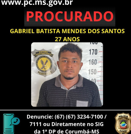 A Justiça já havia expedido mandado de prisão contra Gabriel dos Santos. “Ele está preso, vai prestar depoimento e será encaminhado para o Estabelecimento Penal Masculino”, informou ao Diário Corumbaense o delegado Guilherme Oliveira Pena. A Polícia Civil continua com as investigações.