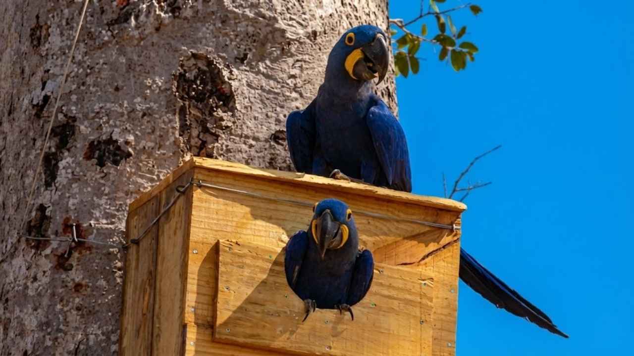 Filhote de arara-azul encanta internet com seu primeiro voo no Pantanal
