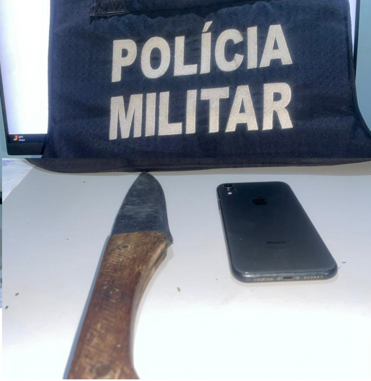 Após roubar um celular, ele fugiu, mas foi localizado pouco depois pela Polícia Militar, ainda com a faca utilizada no crime e o celular roubado, que foi reconhecido pela vítima.