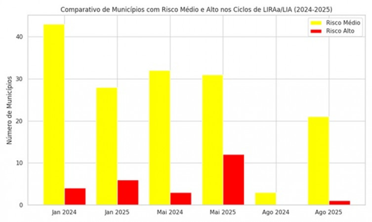 Em agosto de 2024, os números foram os mais baixos do período, com apenas 3 municípios em risco médio e nenhum em risco alto; no entanto, agosto de 2025 mostrou uma reversão dessa tendência, com 21 municípios em risco médio e 1 em risco alto.