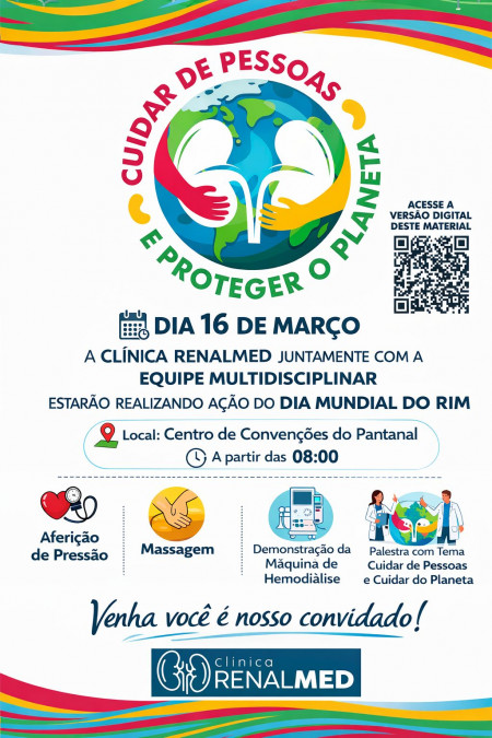 Em alusão ao Dia Mundial do Rim, celebrado em 12 de março, a Clínica Renalmed realizará uma ação especial de conscientização e promoção da saúde voltada à população, no dia 16 de março, em Corumbá. O evento acontecerá a partir das 8h, no Centro de Convenções do Pantanal, reunindo profissionais de uma equipe multidisciplinar para orientar e atender o público.
