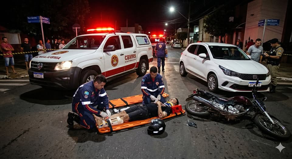Na ultima noite de sábado, por volta das 21h00, o Corpo de Bombeiros Militar atendeu uma ocorrência de sinistro de trânsito do tipo colisão entre carro e motocicleta, na rua Cáceres, entre as ruas Totico de Medeiros e Sargento Aquino, bairro Centro América.